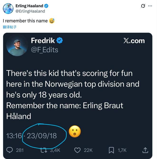 这位名叫弗雷德里克的网友2018年9月23日曾经在社交媒体上发文写道:“现在有个孩子在挪威的顶级联赛以进球为乐,他只有18岁。记住这个名字:埃尔林-布劳特-哈兰德。”7年后的今天,哈兰德在社交媒体上转发了这位网友的言论,同时他还配文写道:“我记得他的名字。”【上咪咕独家看