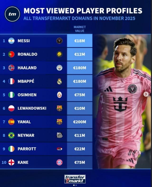 德转列出了11月份球员页面浏览量排名,前三依次为梅西、C罗、哈兰德。11月德转球员页面浏览量排名:1、梅西2、C罗3、哈兰德4、姆巴佩5、奥斯梅恩6、莱万7、亚马尔8、内马尔9、帕洛特10、凯恩今日(12.3)08:30 NBA常规赛 开拓者 - 猛龙09:00 NBA常规赛 尼克斯 - 凯尔特人09:00 NBA常规赛 森林狼 - 鹈鹕09:00 NBA常规赛 灰熊 - 马刺11:00 NCAA常规赛 南加州大学 - 俄勒冈大学12:00 NBA常规赛 雷霆 - 勇士13:00 国际乒联混合团体世界杯循环赛阶段2 中国乒乓球队 - 克罗地亚乒乓球队14:30 中国网球巡回赛总决赛-男&女单打小组赛第2轮15:00 CBA俱乐部杯长沙赛区 天津 - 山东15:30 CBA俱乐部杯南昌赛区 上海 - 四川17:00 CBA俱乐部杯南宁赛区 吉林 - 福建17:00 CBA俱乐部杯武汉赛区 山西 - 广州19:30 CBA俱乐部杯长沙赛区 青岛 - 广厦19:30 CBA俱乐部杯南昌赛区 同曦 - 北控20:00 CBA俱乐部杯南宁赛区 新疆 - 浙江20:00 CBA俱乐部杯武汉赛区 辽宁 - 江苏22:00 意杯第3轮 亚特兰大 - 热那亚明晨(12.4)01:00 德国杯1/8决赛 波鸿 - 斯图加特01:00 德国杯1/8决赛 弗赖堡 - 达姆施塔特01:00 意杯第3轮 那不勒斯 - 卡利亚里02:00 西甲第19轮 毕尔巴鄂竞技 - 皇家马德里03:30 英超第14轮 阿森纳 - 布伦特福德03:30 英超第14轮 布莱顿 - 阿斯顿维拉03:30 英超第14轮 伯恩利 - 水晶宫03:30 英超第14轮 狼队 - 诺丁汉森林03:45 德国杯1/8决赛 柏林联合 - 拜仁慕尼黑03:45 德国杯1/8决赛 汉堡 - 荷尔斯泰因基尔04:00 意杯第3轮 国际米兰 - 威尼斯04:00 国王杯第2轮 金塔纳 - 埃尔切04:00 国王杯第2轮 托伦CF - 皇家贝蒂斯04:00 国王杯第2轮 雷乌斯 - 皇家社会04:00 国王杯第2轮 希叶扎 - 莱万特04:00 国王杯第2轮 欧伦塞 - 赫罗纳04:00 国王杯第2轮 安东亚诺 - 比利亚雷亚尔04:15 英超第14轮 利兹联 - 切尔西04:15 英超第14轮 利物浦 - 桑德兰06:30 巴甲第37轮 尤文图德 - 桑托斯
