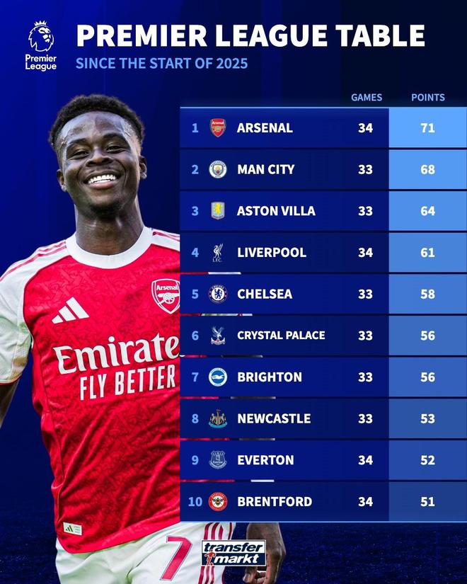 2025年英超积分排行:枪手71分居首,曼城68分第二,维拉第三