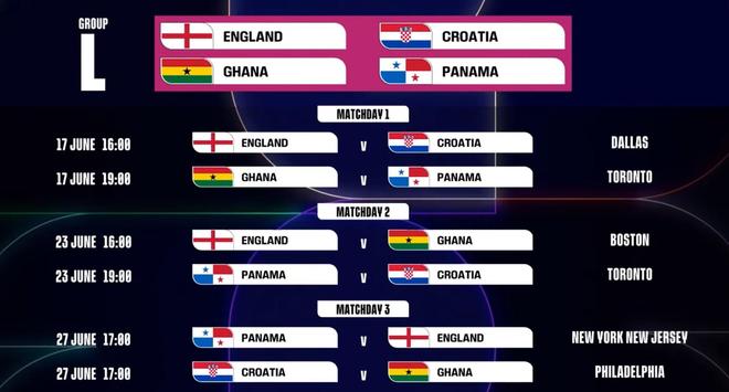 世界杯小组赛L组赛程(以下均为北京时间):第一轮:6月18日06:00 英格兰vs克罗地亚 比赛地点:达拉斯6月18日08:00 加纳vs巴拿马 比赛地点:多伦多第二轮:6月24日05:00 英格兰vs加纳 比赛地点:波士顿6月24日08:00 巴拿马vs克罗地亚 比赛地点:多伦多第三轮:6月28日06:00 巴拿马vs英格兰 比赛地点:纽约新泽西6月28日06:00 克罗地亚vs加纳 比赛地点:费城【上咪咕独家看