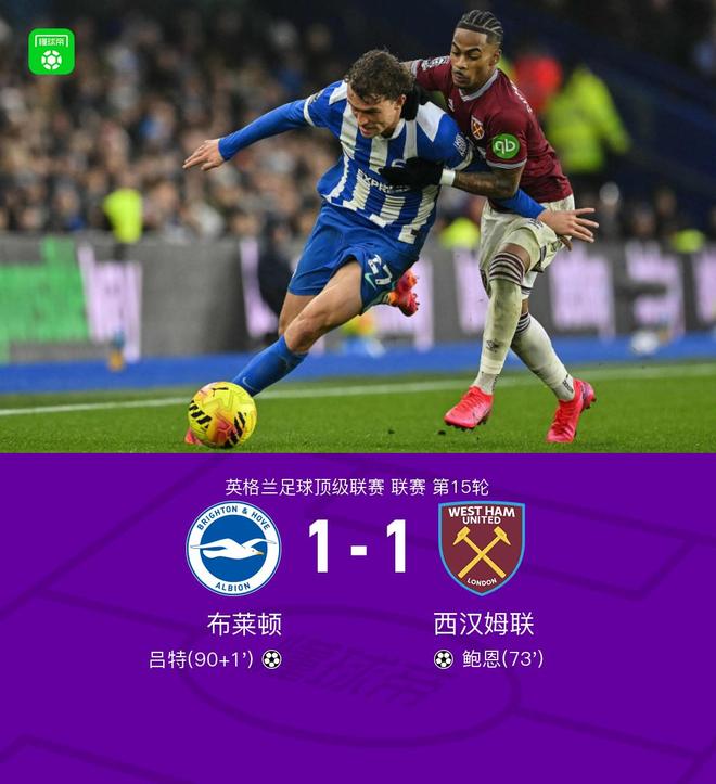 北京时间12月7日,英超联赛第15轮,布莱顿坐镇主场迎战西汉姆联。上半场,帕奎塔远射造险;下半场,威尔逊助攻,鲍恩倒地情况下小角度破门。随后,吕特乱战中小角度破门扳平比分。费布鲁亨屡献神扑。最终双方1比1握手言和。关键事件第73分钟,鲍恩倒地情况下小角度破门,西汉姆联1-0布莱顿